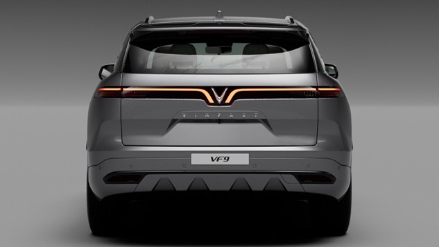 Thiết kế kiểu “thắt eo”, sơn đen tạo hiệu ứng mui bay cho VF 9, tại trung tâm là logo VinFast đầy kiêu hãnhĐuôi xe